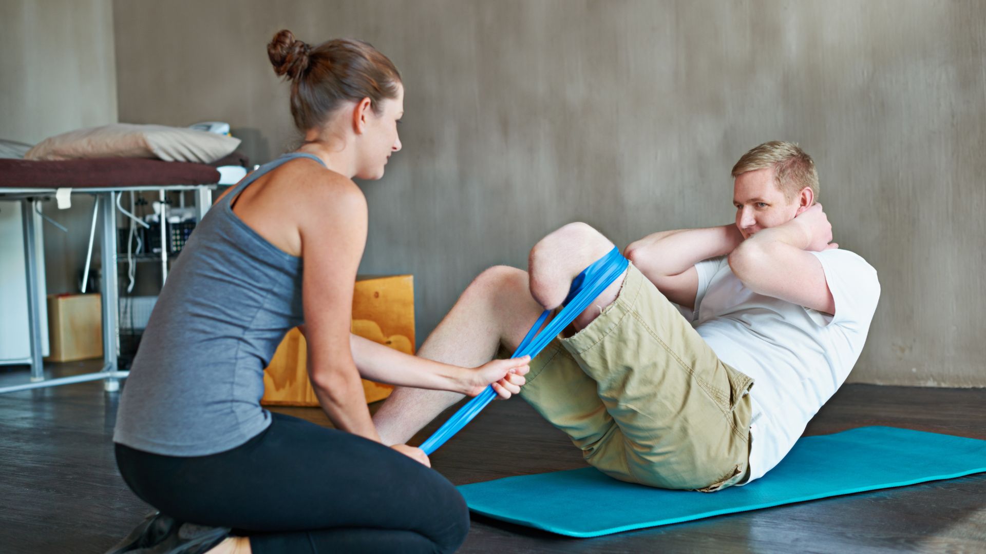 A physical therapist assisting a man with core exercises using a resistance band while he performs sit-ups on a yoga mat.